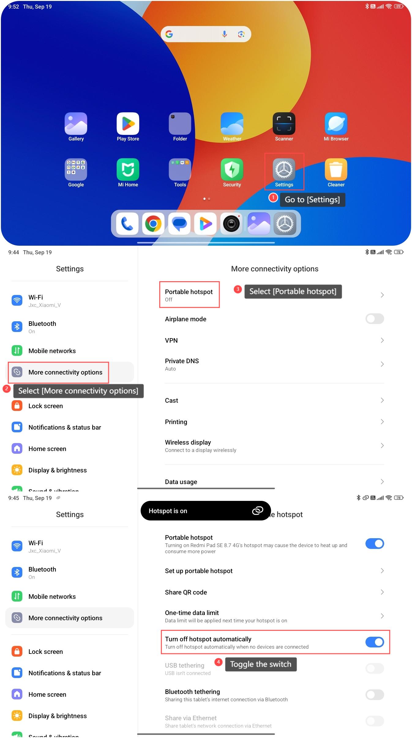 Il Redmi Pad SE 8.7 4G supporta la funzione integrata di disattivare automaticamente l'hotspot quando non sono collegati dispositivi. Nel caso in cui dimentichi di spegnere l'hotspot in tempo, questa funzione può disattivare automaticamente l'hotspot per ridurre l'utilizzo della rete.