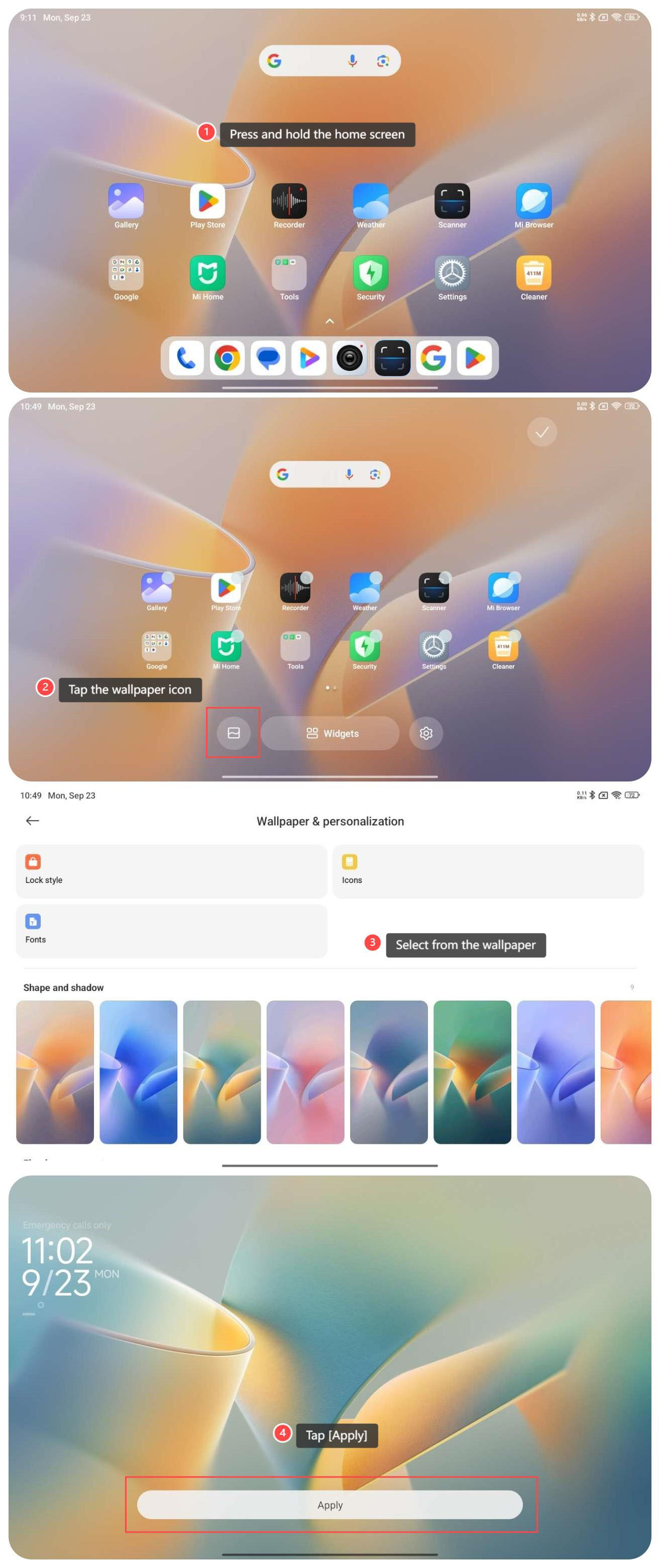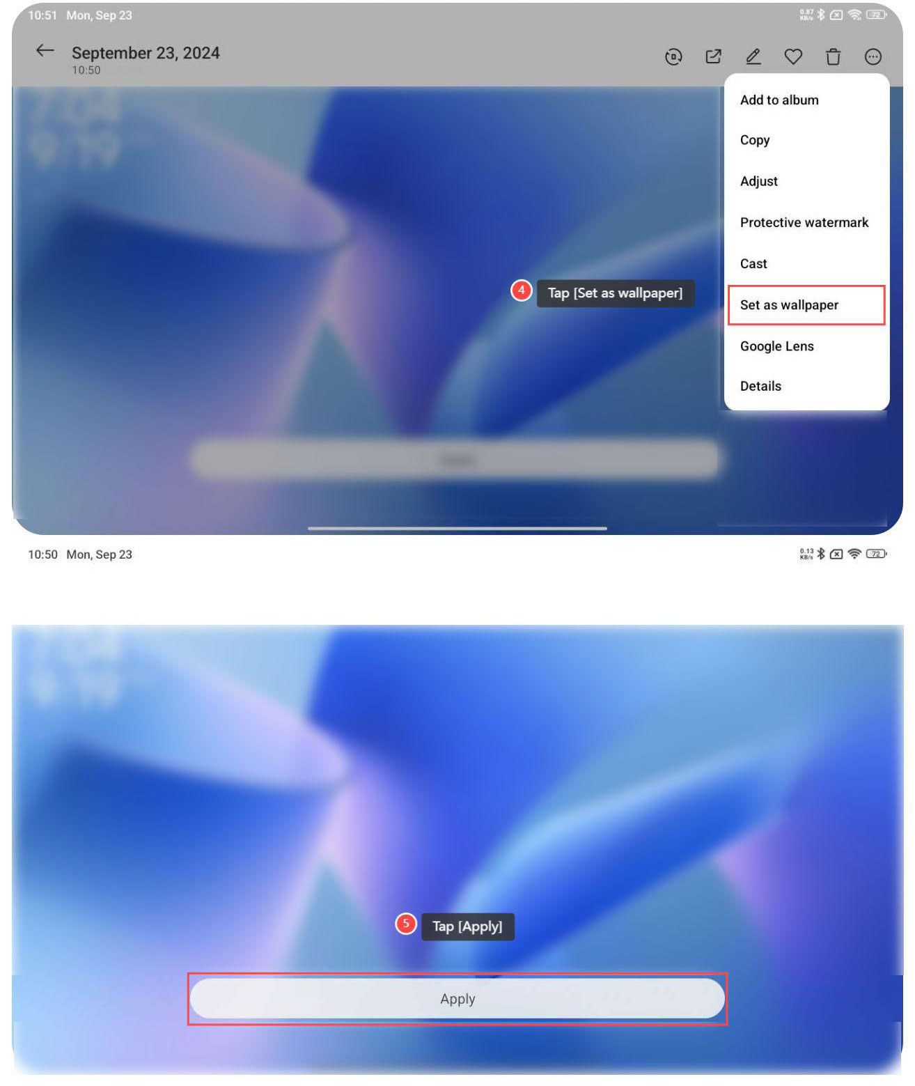 4. Toccare [Imposta come sfondo]; 5. Toccare [Applica] per utilizzare lo sfondo.
