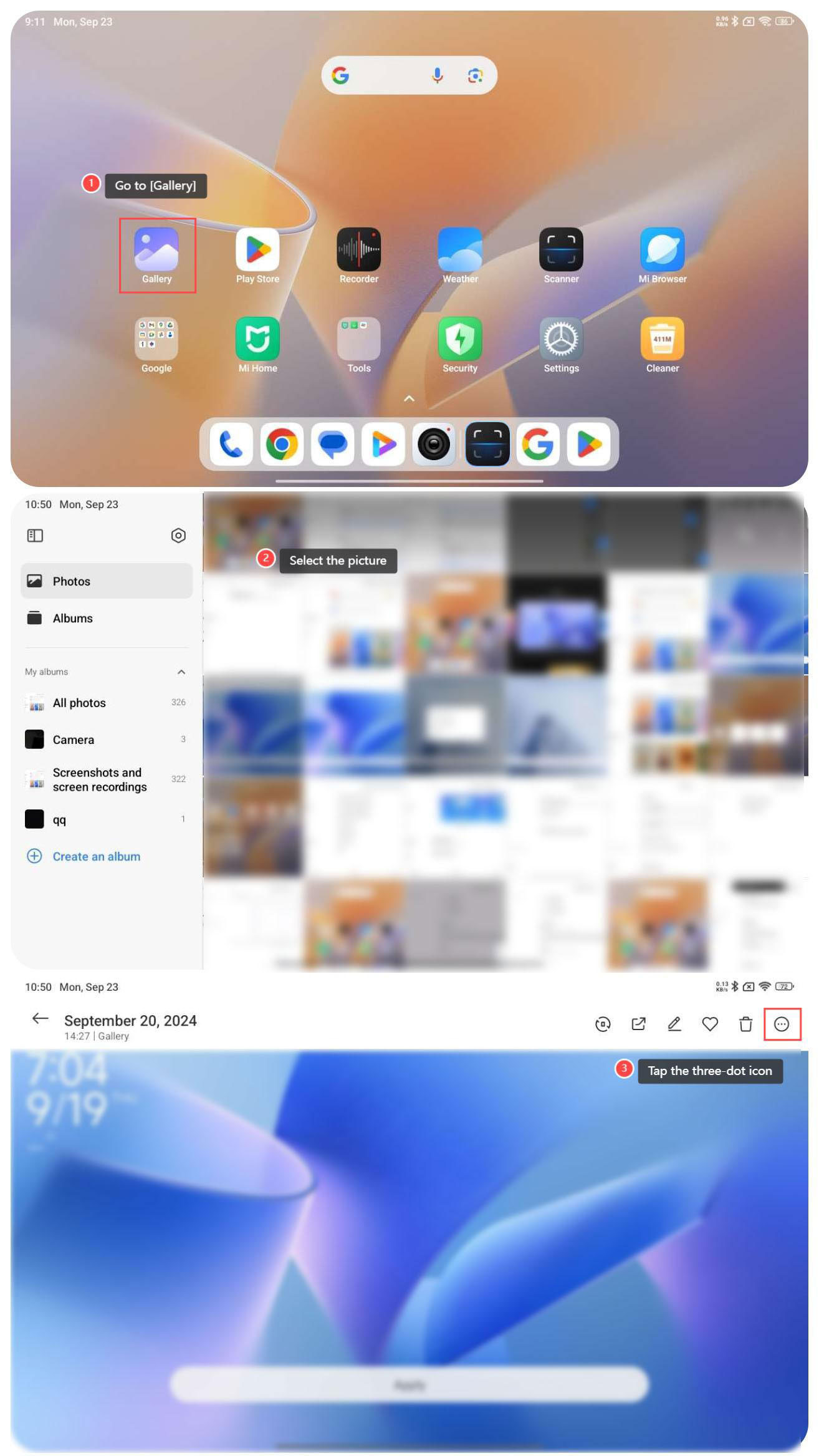 Il Redmi Pad SE 8.7 4G supporta l'impostazione dello sfondo della schermata iniziale, che ti consente di esprimere la tua individualità e il tuo stile attraverso immagini o temi scelti. Uno sfondo visivamente accattivante può migliorare il tuo umore e rendere l'utilizzo del dispositivo più piacevole. Cambiare regolarmente lo sfondo può dare al dispositivo una sensazione di freschezza, mantenendoti impegnato e interessato. Per impostare lo sfondo della schermata iniziale sul tablet, fare riferimento ai seguenti metodi: Metodo 1: 1. Tenere premuta la schermata iniziale; 2. Tocca l'icona dello sfondo; 3. Seleziona lo sfondo in base alle tue preferenze; 4. Toccare [Applica] per utilizzare lo sfondo. Metodo 2: 1. Vai su [Impostazioni]; 2. Tocca [Sfondo e personalizzazione]; 3. Seleziona lo sfondo in base alle tue preferenze; 4. Toccare [Applica] per utilizzare lo sfondo. Metodo 3: 1. Vai a [Galleria]; 2. Selezionare l'immagine che si desidera impostare come sfondo; 3. Tocca l'icona a tre punti nella parte superiore destra dello schermo;