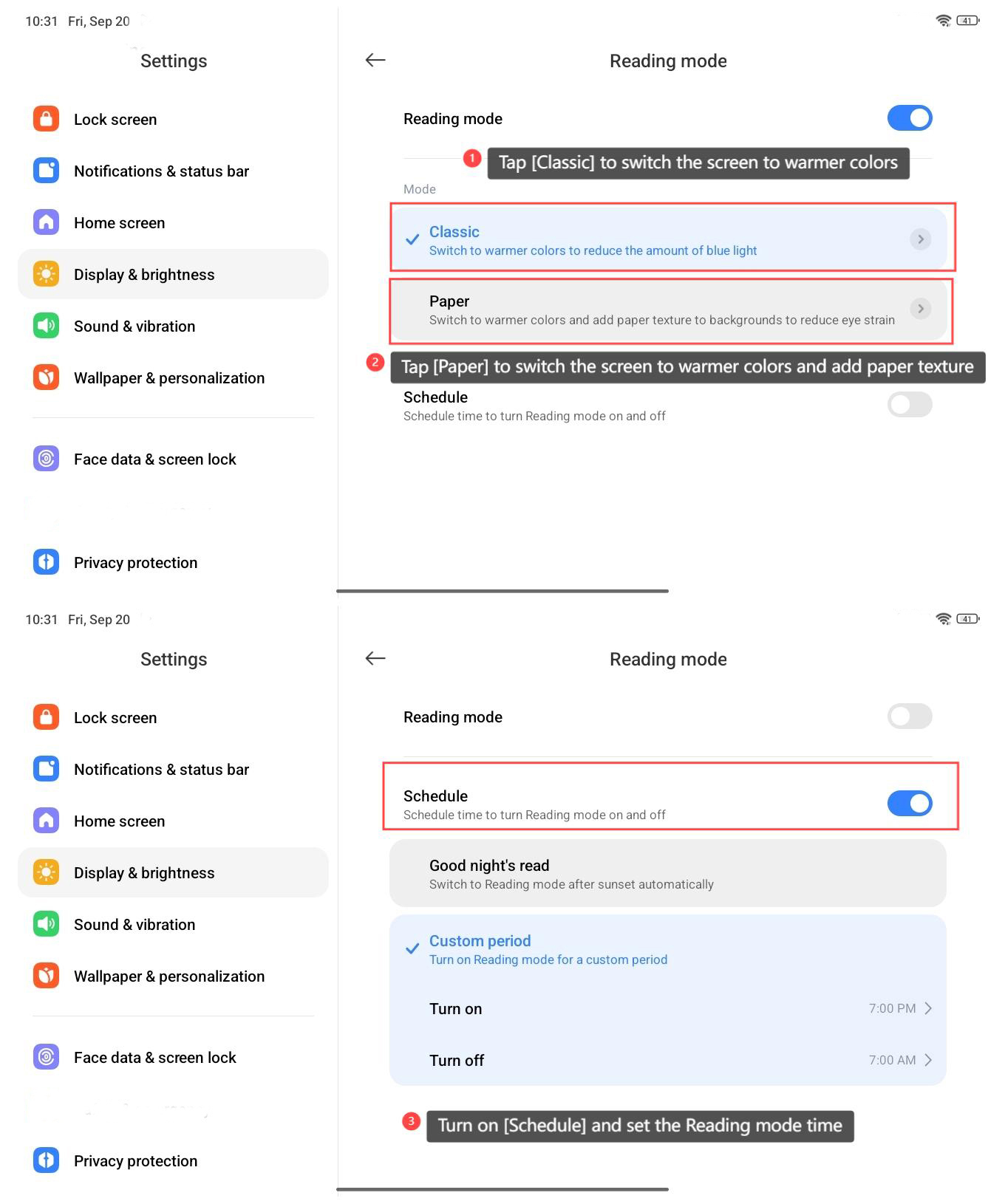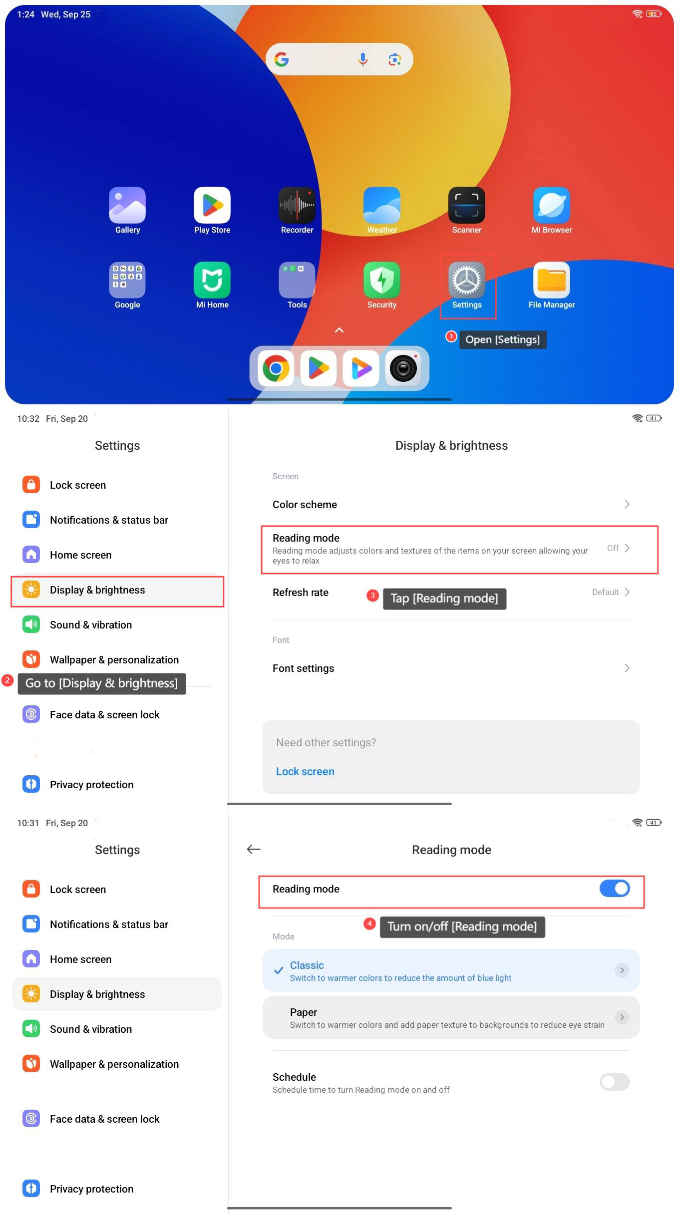 La modalità di lettura sul Redmi Pad SE 8.7 è una funzione progettata per migliorare l'esperienza di lettura riducendo l'affaticamento degli occhi. Quando attivato, può regolare la temperatura del colore dello schermo su toni più caldi, il che aiuta a ridurre al minimo l'esposizione alla luce blu. Questo può rendere il testo più facile da leggere e più confortevole per gli occhi, soprattutto durante le sessioni di lettura prolungate. Per abilitare/disabilitare la modalità di lettura sul Redmi Pad SE 8.7, fare riferimento ai seguenti metodi: Metodo 1: 1. Apri [Impostazioni]sul tuo tablet; 2. Vai su [Display e luminosità]; 3. Toccare [Modalità lettura]; 4. Attivare/disattivare [Modalità lettura]. Metodo 2: 1. Scorri verso il basso dall'angolo in alto a destra dello schermo per accedere al centro di controllo; 2. Toccare l'icona [Modalità lettura] per attivare/disattivare rapidamente. Nota: 1. È possibile toccare [Classico] per passare lo schermo a colori più caldi per ridurre la quantità di luce blu; 2. È inoltre possibile toccare [Carta] per passare lo schermo a colori più caldi e aggiungere texture di carta agli sfondi per ridurre l'affaticamento degli occhi; 3. Attivare [Programma] e impostare il tablet in modo che attivi automaticamente la modalità di lettura dopo il tramonto o in un momento personalizzato.