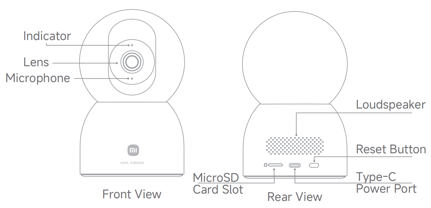 1. La parte anteriore della Xiaomi Smart Camera C700 è dotata di un indicatore, un obiettivo e un microfono. Nella parte inferiore della parte frontale, c'è un logo Xiaomi, con la scritta "4K HDR" posizionata appena sotto di esso;