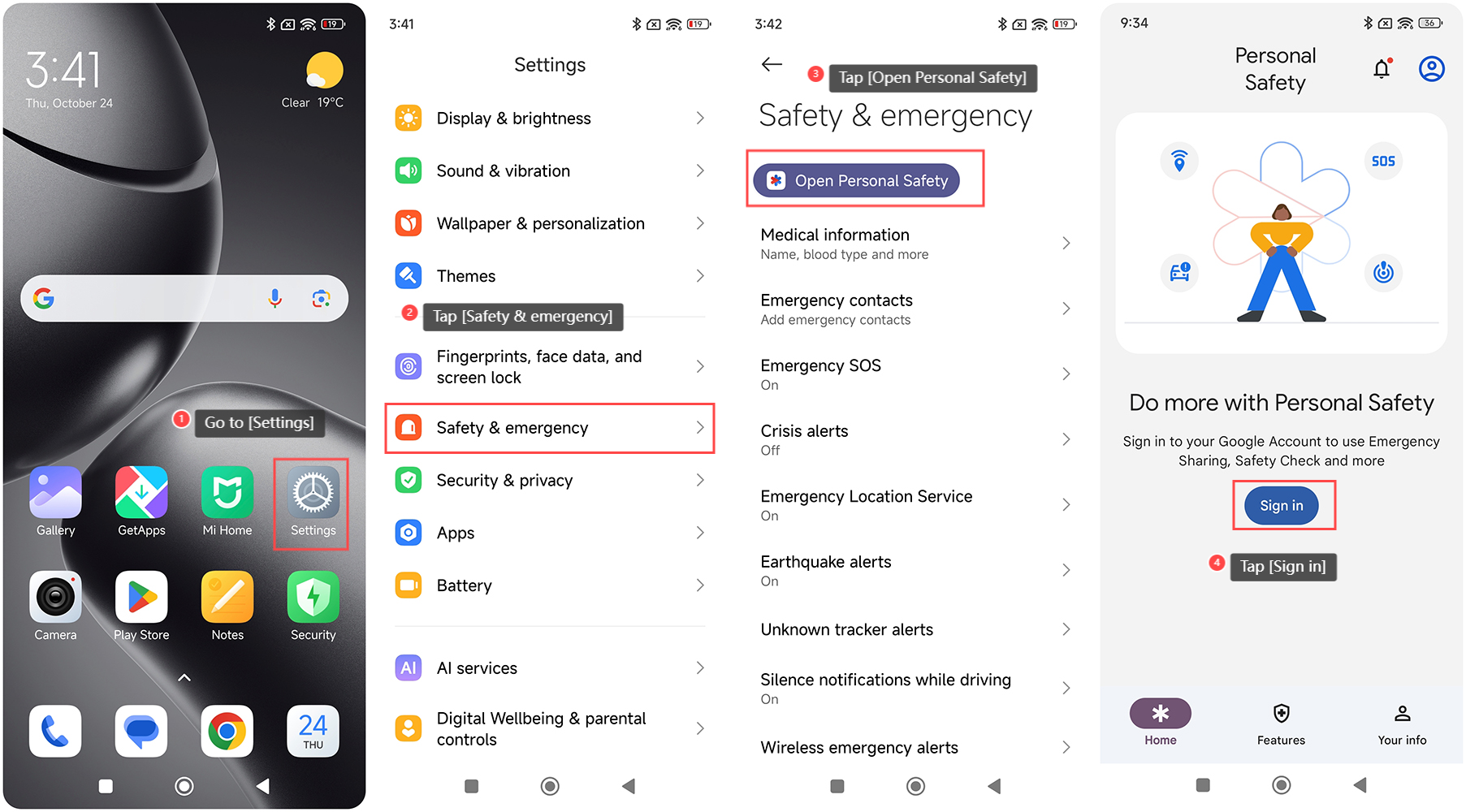 Lo Xiaomi 14T supporta l'apertura della sicurezza personale, che può inviare avvisi ai contatti designati in caso di emergenza, consentendoti di condividere la tua posizione in tempo reale con contatti fidati per la sicurezza e dandoti un rapido accesso ai contatti e ai servizi di emergenza. Le funzioni di apertura della sicurezza personale contribuiranno a migliorare la sicurezza personale e a garantire che tu sia preparato in caso di emergenza. Questa funzione offre tranquillità, sapendo che l'aiuto è a portata di tocco quando è più necessario.