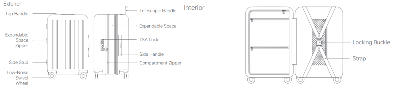 Lo Xiaomi Expandable Luggage è progettato con cura per comodità e sicurezza, sia all'interno che all'esterno. Le caratteristiche esterne includono una maniglia superiore e una maniglia telescopica per un sollevamento e una manovra versatili, insieme a ruote girevoli a bassa rumorosità che garantiscono un movimento fluido e silenzioso in qualsiasi direzione. La sua cerniera spaziale espandibile consente una maggiore capacità di stoccaggio, mentre il lucchetto TSA offre una chiusura sicura ma accessibile approvata dalla Transportation Security Administration. Inoltre, una maniglia laterale e borchie laterali offrono stabilità e opzioni di trasporto alternative, con una cerniera dello scomparto per un facile accesso agli oggetti essenziali. All'interno, il bagaglio è dotato di una fibbia di bloccaggio e cinghie per mantenere gli effetti personali organizzati e al sicuro durante il viaggio, evitando che gli oggetti si spostino o si pieghino.