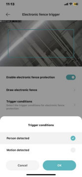 Dopo l'apertura, quando qualcuno entra nel raggio d'azione della recinzione elettronica (lo schermo della telecamera deve essere visualizzato orizzontalmente), verrà emesso un allarme; Le condizioni di attivazione possono essere selezionate