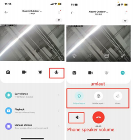 1 、 Chiamata vocale: è necessario accedere alla schermata di monitoraggio della fotocamera, fare clic sul pulsante del microfono e poter effettuare una chiamata remota con la fotocamera tramite l'APP Mi Home del telefono cellulare.