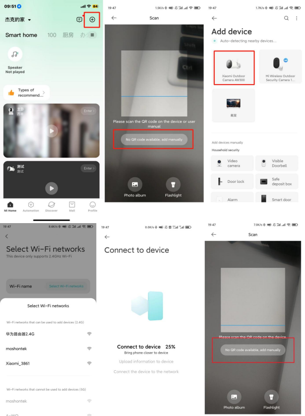 2. D: Xiaomi Outdoor Camera AW300 Cosa devo fare se il video si blocca e l'immagine e l'audio non sono sincronizzati durante la visualizzazione dello schermo della fotocamera?A: 1. Quando il video è balbettante o il display si carica frequentemente, impostare la nitidezza del video in modalità automatica o fluida;Quando l'immagine e l'audio non sono sincronizzati, verificare se la rete connessa alla fotocamera è normale, se il ritardo è troppo grande, è possibile provare a uscire.3. D: Il codice QR Xiaomi Outdoor Camera AW300 è danneggiato, non riesce a vedere chiaramente, non riesce a scansionare, connettersi o associare, cosa fare quando "la trasmissione al dispositivo non è riuscita"?A: Processo di rilegatura:Xiaomi Outdoor Camera AW300 Assicurati che sia acceso.È possibile aggiungere manualmente il metodo del codice di associazione di verifica: inserisci il Mi Home-Device-angolo in alto a destra "+"Aggiungi dispositivo-Fai clic su Cerca" per ingrandirelo specchio "Invio" Xiaomi Outdoor Camera AW300"-Seleziona "Xiaomi Outdoor Camera AW300"- Seleziona "Ripristino dispositivo" e fai clic su "Avanti" - Inserisci il nome e la password WiFi - Tieni premutoXiaomi Outdoor Camera AW300 in bassoTasto di ripristino (il pulsante di ripristino si trova all'interno del coperchio protettivo nella parte inferiore del dispositivo, è necessario rimuovere il coperchio protettivo con un cacciavite) Dopo più di 10 secondi, il dispositivo si ripristina Fare clic su Avanti dopo che viene visualizzata la voce "Attendi connessione" - selezionare "Aggiungi