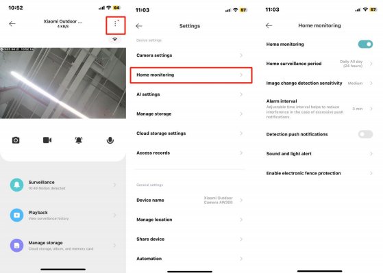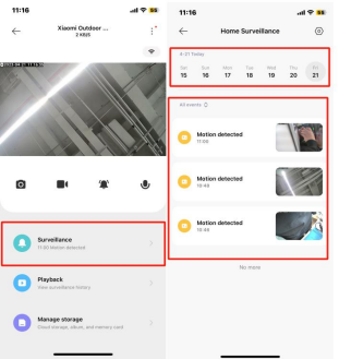 3. D: Xiaomi Outdoor Camera AW300 Come visualizzare le impostazioni pertinenti?A: Entra nella fotocamera da esterno Xiaomi AW300, fai clic su "Sorveglianza domestica" in basso per entrare, puoi visualizzarela schermatadi ripresa "cambio schermo" della fotocameraunaperuna;Fare clic su "Lookback" per visualizzare la schermata di scatto continuo durante il giorno; Fare clic su Gestione archiviazione per visualizzare gli scatti segmentati per l'intera giornata o eliminare i video dalla scheda di memoria.