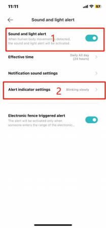2.Attivare l'impostazione della spia nell'allarme sonoro e luminoso, attivare l'avviso luminoso quando rileva che qualcuno si sta muovendo e regolare anche la