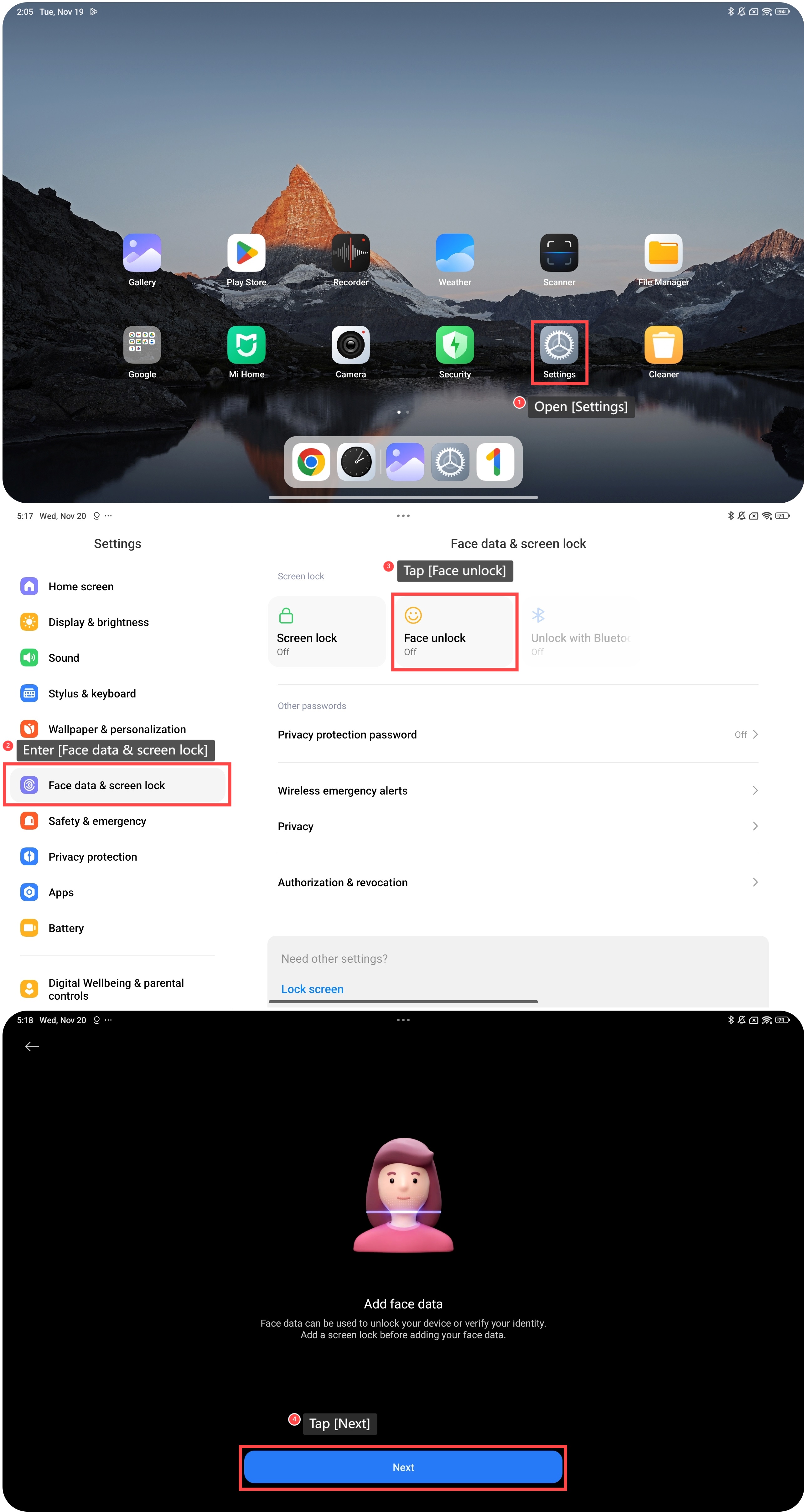 Per impostare lo sblocco facciale sul tablet, fare riferimento ai seguenti passaggi: