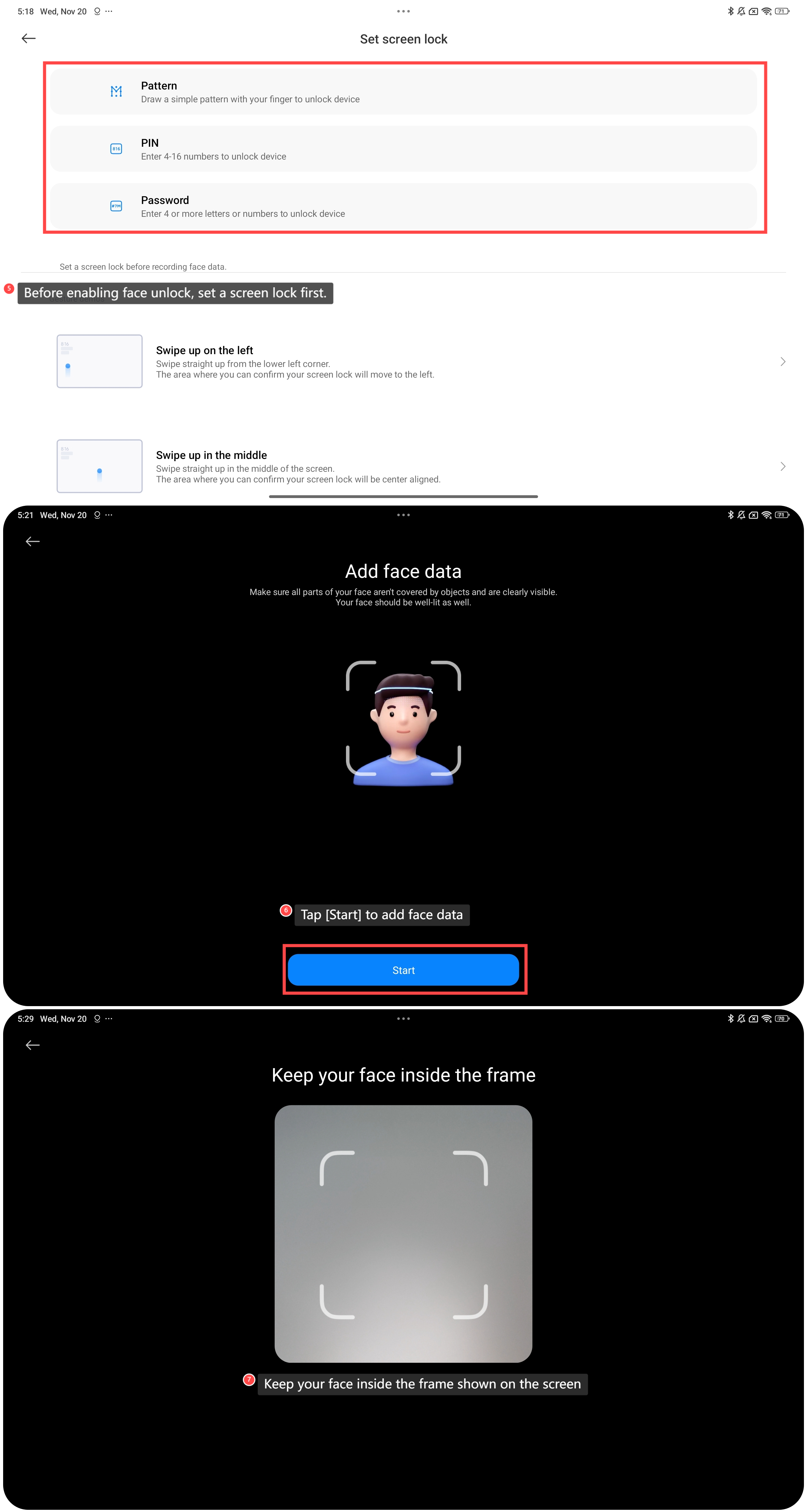5. Prima di abilitare lo sblocco facciale, impostare prima un blocco schermo. Puoi scegliere [Sequenza], [PIN] o [Password] come preferisci;