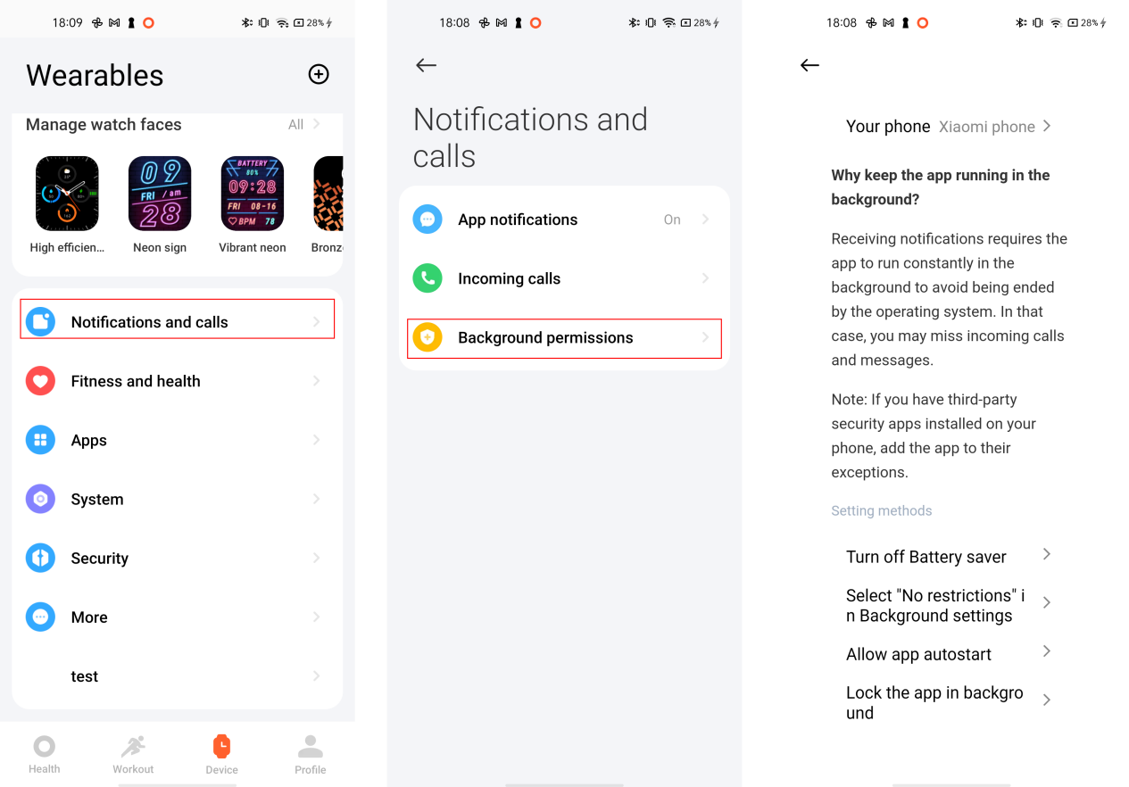 Per utilizzare meglio l'orologio ed evitare la pulizia della memoria con un solo tocco nel sistema Android e alcuni processi di pulizia o intercettazione del software di pulizia. Si consiglia di mantenere l'APP Mi Fitness in esecuzione in background. Il percorso di apertura è il seguente: Dopo l'associazione, puoi toccare [Dispositivo] >> [Notifiche e chiamate] >> [Autorizzazioni in background] >> seguire le istruzioni sull'APP Mi Fitness.
