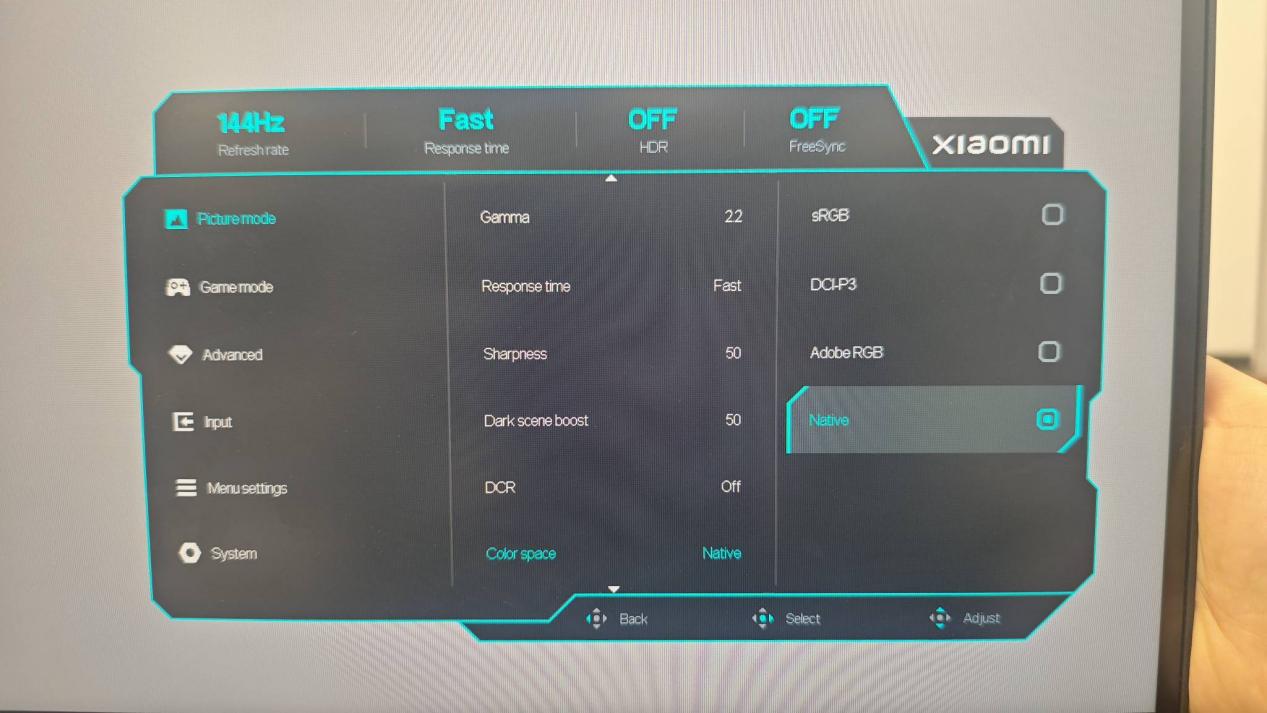 4. Dopo aver impostato lo spazio colore su [Nativo], è possibile regolare ulteriormente l'immagine regolando [Impostazione colore], [Tonalità] e [Saturazione] per diminuire o aumentare il calore del colore e ottenere l'effetto di visualizzazione più adatto.