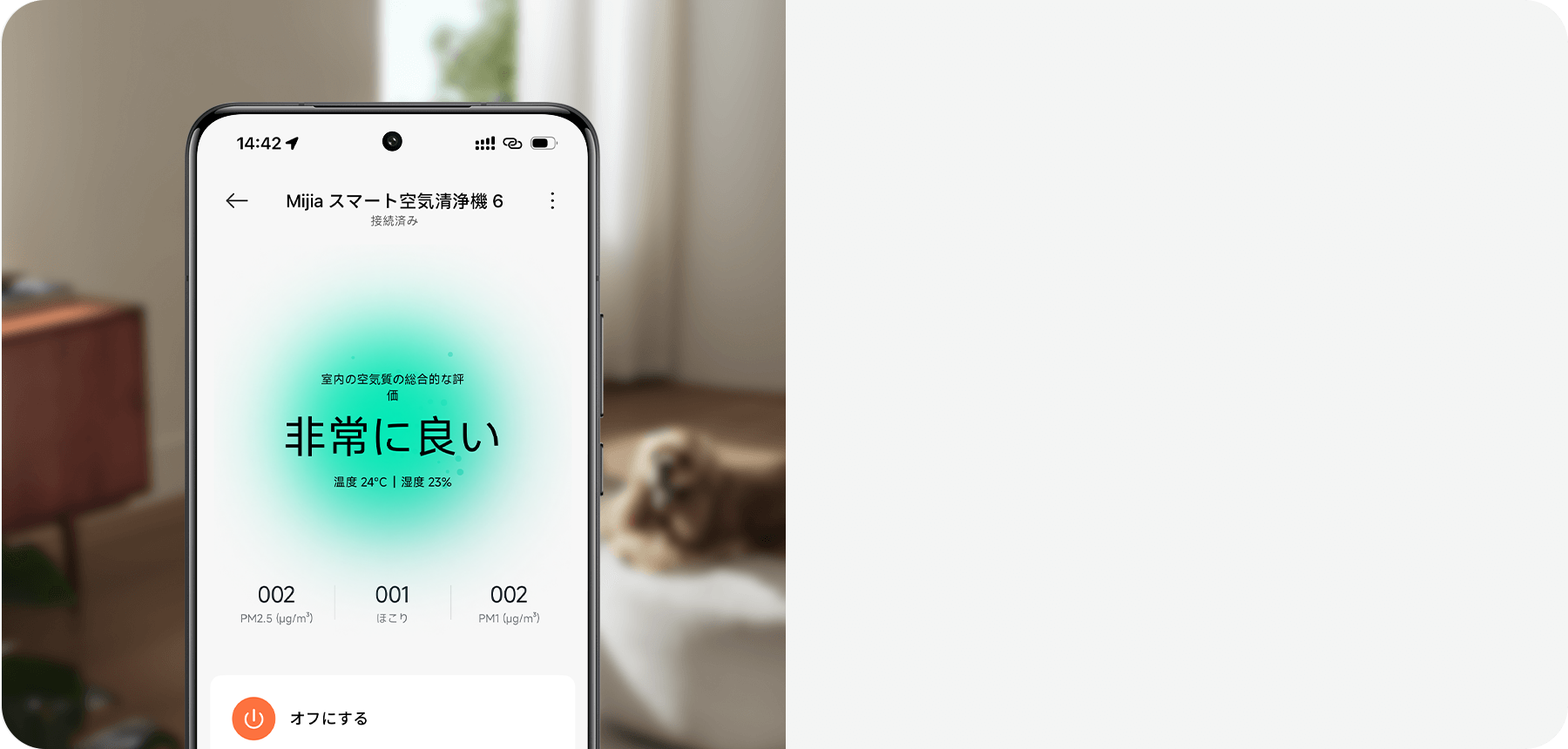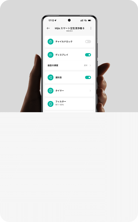 Xiaomi Home アプリを使えば、空気質のモニタリング、リモート操作、電源オン・オフのスケジュール設定、フィルター残量の確認が可能です。