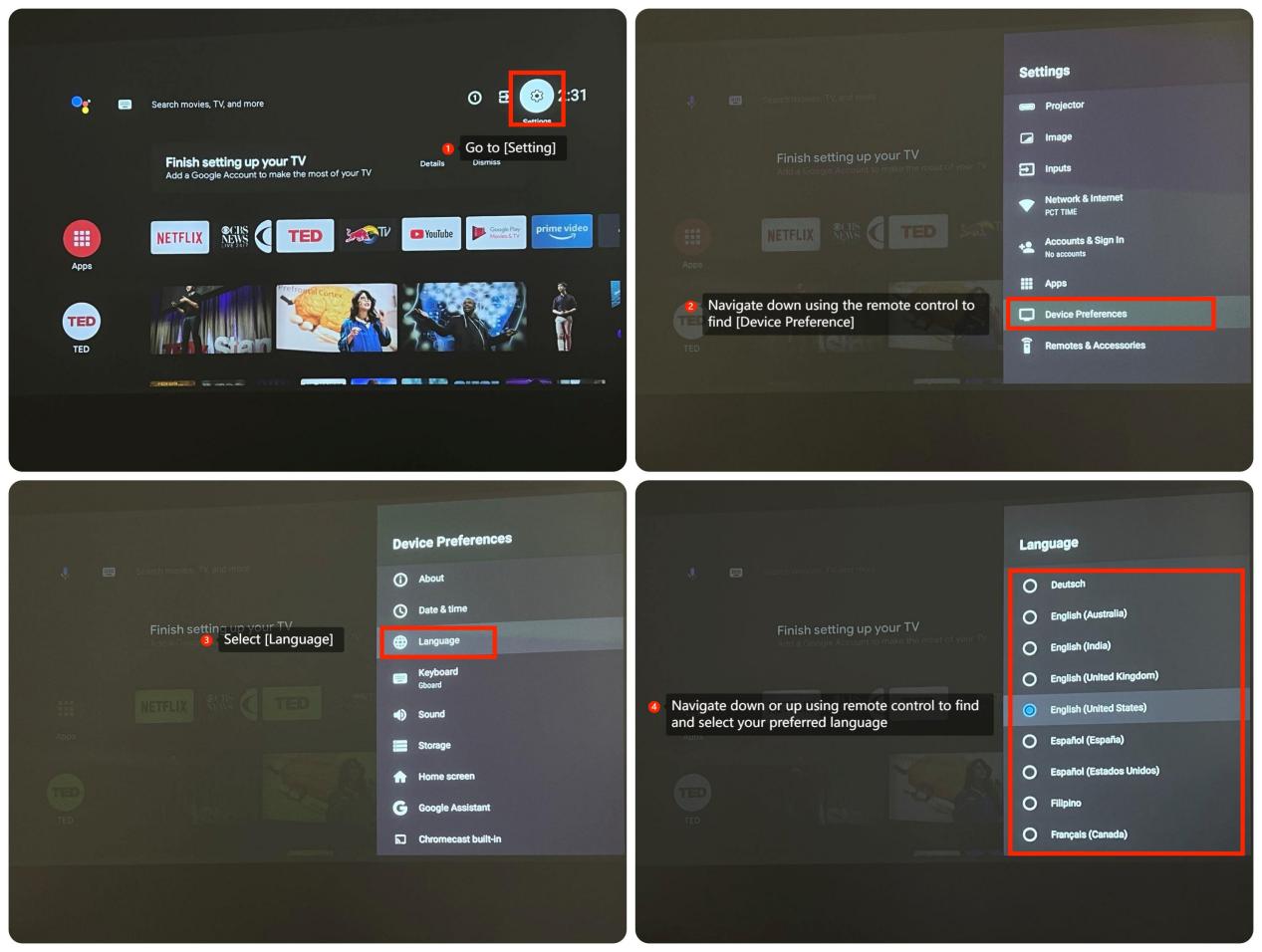 4. リモコンを使用して上下に移動し、希望の言語を見つけて選択します
