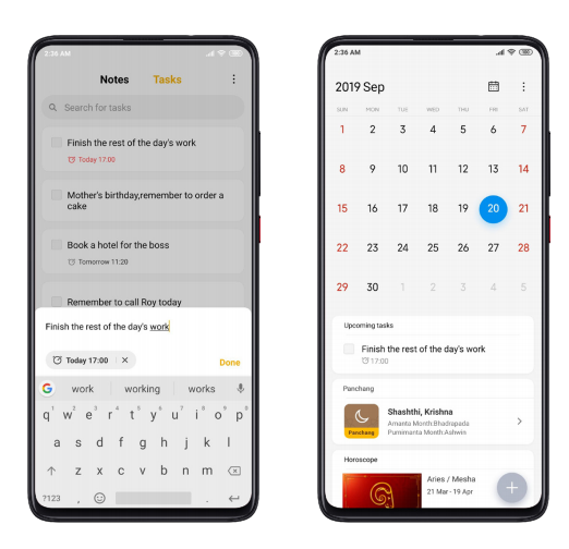 MIUI 11では、Xiaomiはタスクを管理するためのシステムレベルのツールを導入しています。「メモ」アプリケーションのボタンをタップしてタスクを追加してから、その内容を入力または音声入力します。締め切りのあるタスクのリマインダーを追加すると、MIUIはそれらをカレンダーに自動的に同期します。顧客は、タスクツールボックスを使用して、すべてのタスクをスワイプするだけで保持することもできます。