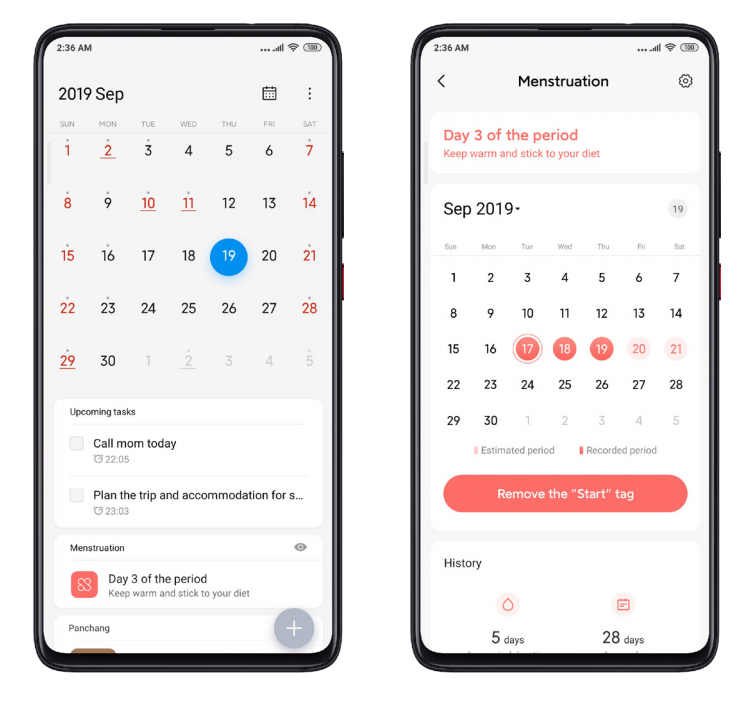 カレンダーアプリで生理の開始と終了を記録すると、次の生理の推奨日を確認し、通知を受け取ることができます。月経履歴を追加して、今後の期間の推奨日の精度を向上させることもできます。