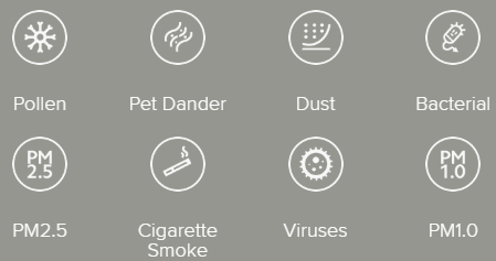 2. 2番目の層はプレミアム高効率フィルターから構成されていて、このフィルターは空気中のバクテリア、ウイルス、タバコの煙、PM2.5、花粉、粉塵、ペットのふけ、その他0.3ミクロン以下のアレルゲンを99.97%除去する効果があります。また、0.1ミクロンの微細な粒子に対しても有効です。