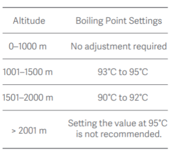 A:水の沸点は高度が上がるにつれて低下するため、沸騰時に水が沸騰しなかったり蒸気が燃えたりする可能性があるため、沸点を異なる高度に設定しないように、高地での沸点を調整することをお勧めします。