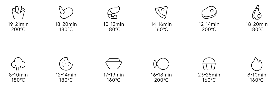 エッグタルト、ケーキ、パン、クッキー、ドライフルーツ、チキンカツレツ、チキンストリップ、チキンレッグ、ステーキ、リブ、ベイクドサツマイモ、フライドポテト、焼き魚、野菜、焼き串焼きなど、さまざまな珍味をフライパンで揚げる/揚げる/ローストする/焼くことができます。