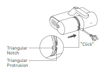 4.ダストコンパートメントアセンブリの三角形のノッチをダニ掃除機の三角形の突起に合わせ、ダストコンパートメントアセンブリを掃除機に押し込みます。「カチッ」という音がしたら正しくインストールされています。