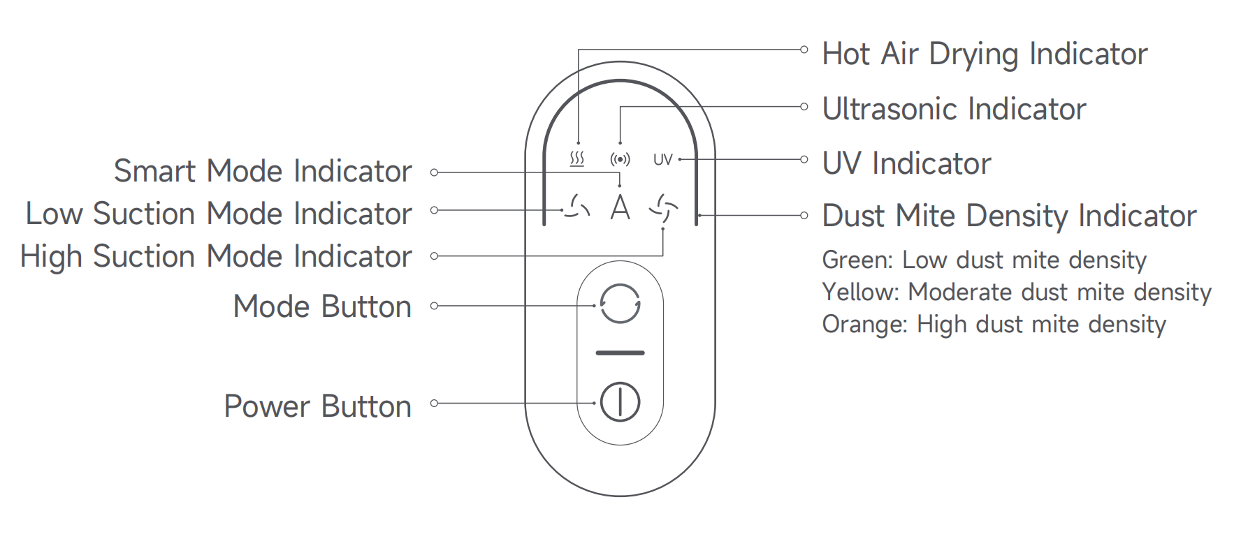 ダニ密度インジケーターには、緑色のライト(ダニ密度が低い)、黄色のライト(チリダニ密度が中程度)、オレンジ色のライト(ダニ密度が高い)の3つのステータスがあります。