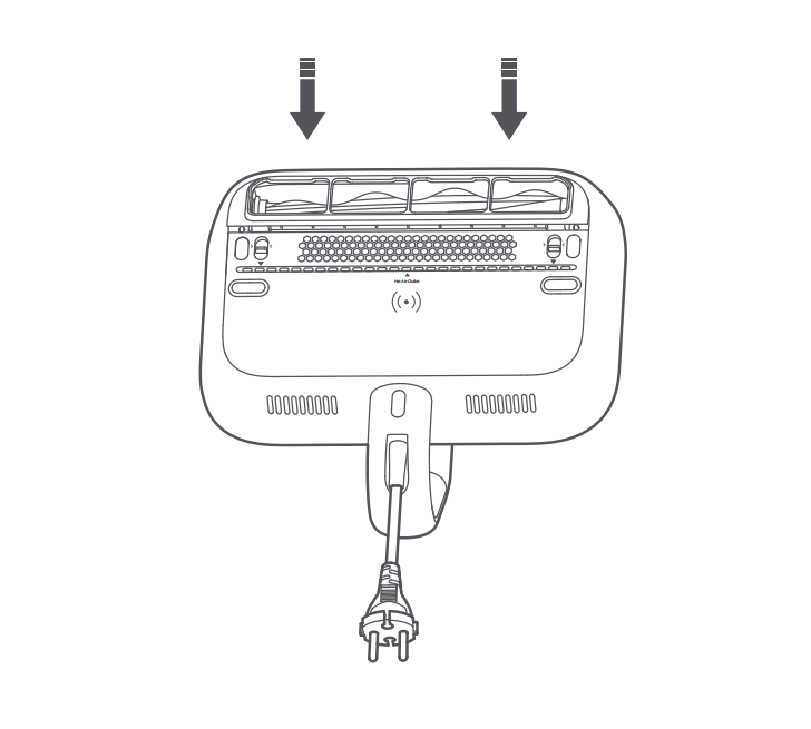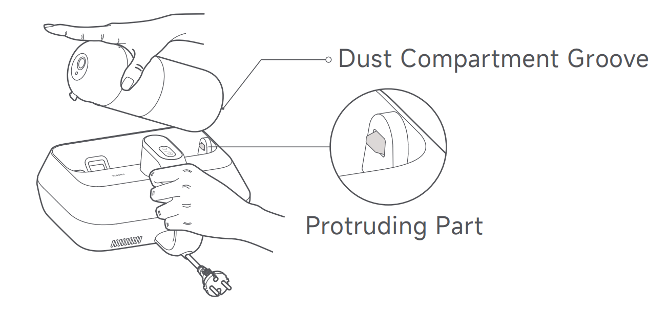 1.ダストコンパートメントの溝を突出部分に合わせます。ダストコンパートメントが所定の位置に取り付けられていることを示す「カチッ」という音が聞こえるまで押し下げます。