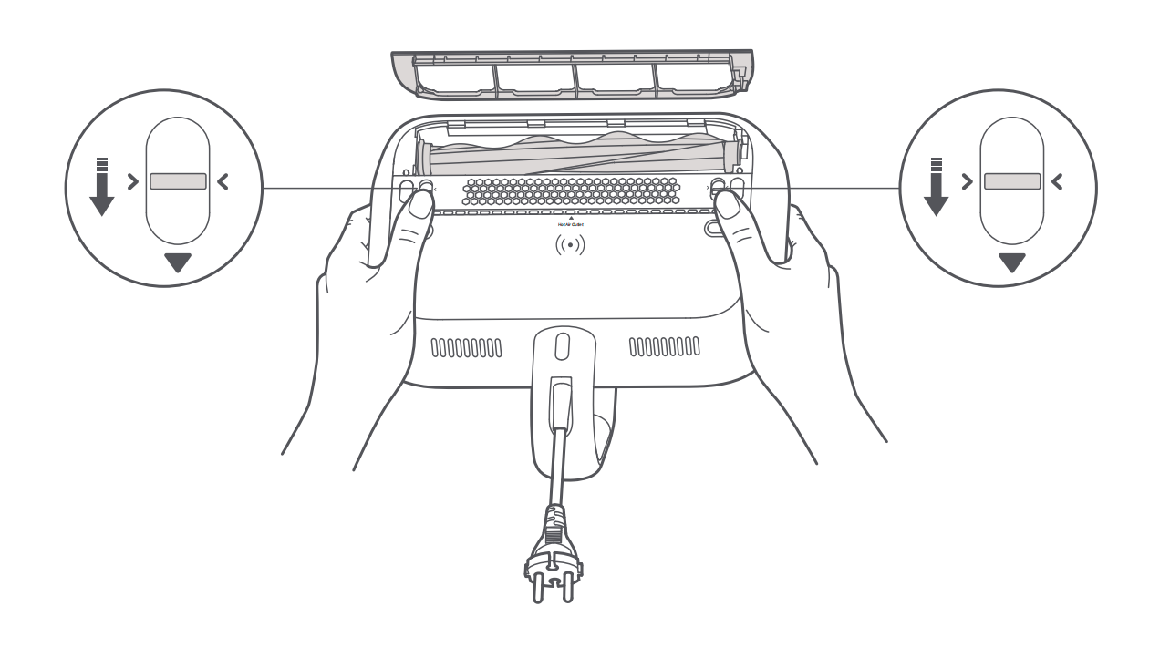 3.清掃後、ローラーブラシを再度取り付けます。次に、ローラーブラシカバーのクリップを対応するスロットに合わせ、ローラーブラシカバーを再度取り付け、「カチッ」という音がするまで押し下げます。