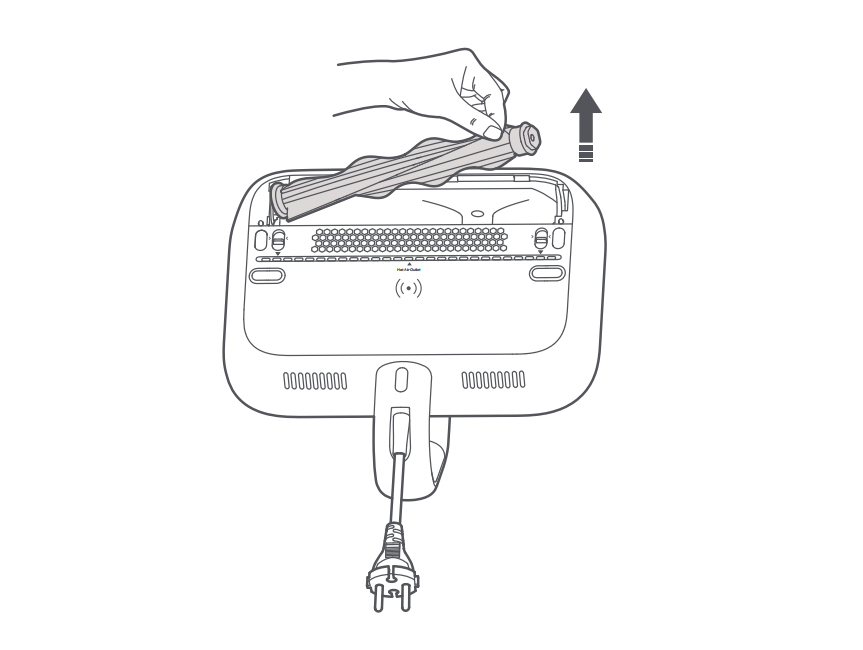 2.ローラーブラシを右側から上に引っ張って取り外します。ローラーブラシから髪の毛やその他の廃棄物を取り除きます。