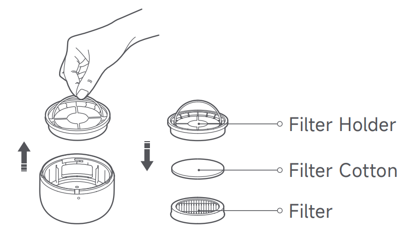 2.フィルターホルダーアセンブリをダストコンパートメントカバーから取り出し、フィルターとフィルターコットンを順番に取り外します。