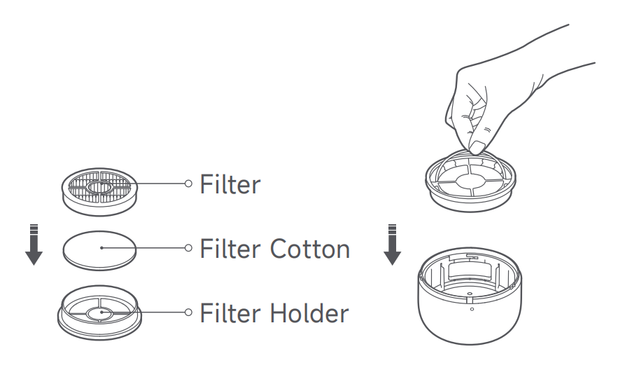 4.フィルターコットンとフィルターをフィルターホルダーに再度取り付け、所定の位置に押し込みます。次に、フィルターホルダーアセンブリをダストコンパートメントカバーに配置し、所定の位置に押し込みます。