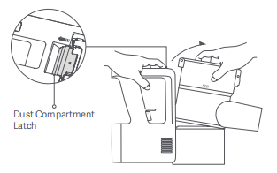 1. ダストコンパートメントラッチを取り外して、ダストコンパートメントを外側に取り外します。