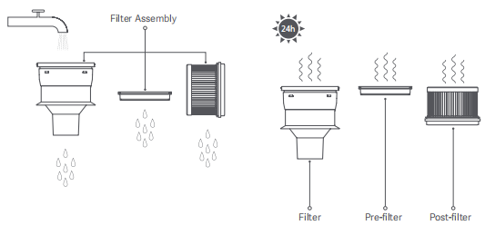 4.フィルター、プレフィルター、ポストフィルターを水道水できれいになるまですすぎ、その後、少なくとも24時間完全に乾かすために脇に置きます。
