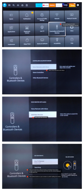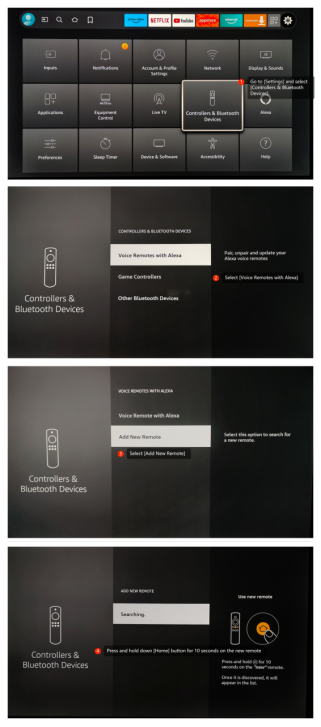 5. リモコンのリセット:右上隅の[設定]に移動し >>下にスクロールして[コントローラーとBluetoothデバイス]を選択し>><c5/>上部の[Alexa付き音声リモコン]を選択し>>[新しいリモコンを追加]を選択して 新しいリモコンを検索し、[左]、[戻る]、[3本の線]を長押し>>リモコンのボタンを同時に押して、リモコンがデバイスリストに表示され>>リモコンの[選択]ボタンを押してリモコンの追加を確認します。