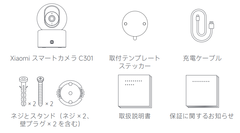 Xiaomi スマートカメラ C301×1、取付テンプレートステッカー×1、充電ケーブル×1、ネジとスタンド(ネジ × 2、 壁プラグ × 2 を含む)、取扱説明書×1、保証に関するお知らせ×1。
