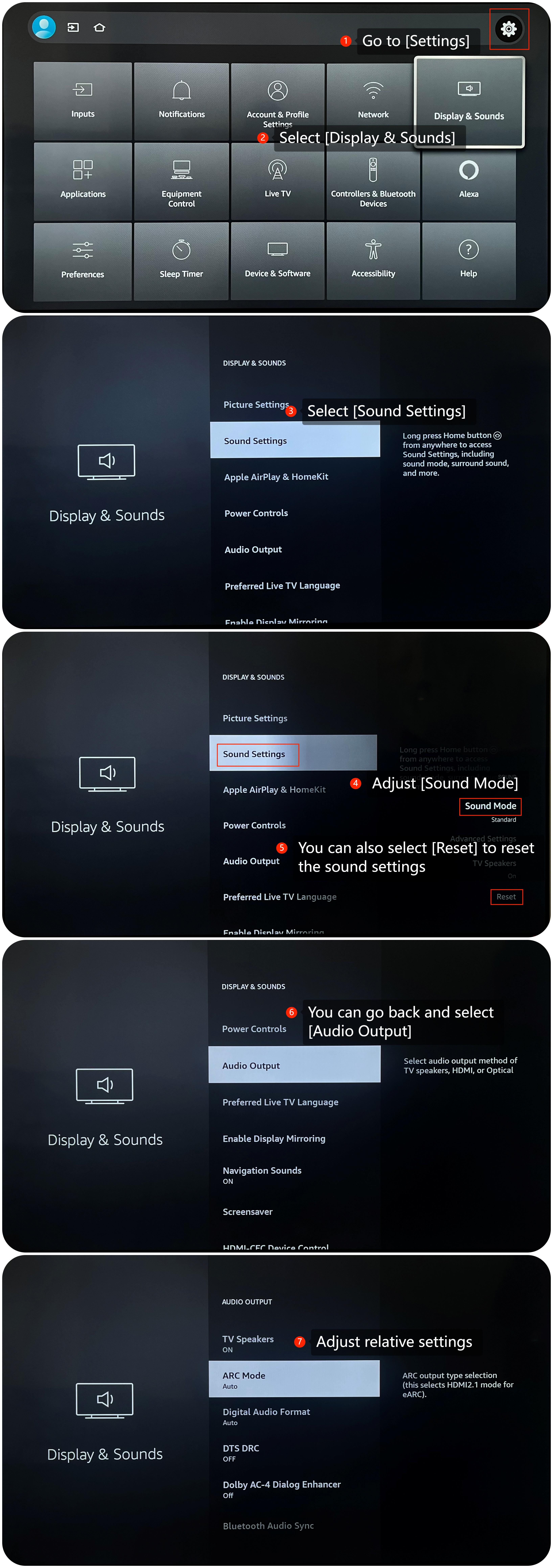 2. [設定]>>[ディスプレイとサウンド]>>[サウンド設定]に切り替えて、[サウンドモード]を調整することで、サウンド設定を確認および調整できます>><c1/>。問題が解決しない場合は、[リセット]を選択してサウンド設定をリセットすることもできます。さらに、戻って[オーディオ出力]を選択し、相対設定を調整することもできます。