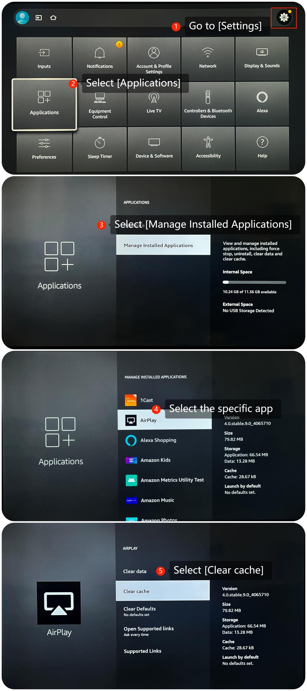 3. [設定] >><c8/> [アプリのライセンス] <c12/>> >[インストールされたアプリケーションの管理] >><c16/><c19/>特定のアプリの>を選択> [クリア キャッシュ] に移動して、アプリのキャッシュとデータを消去してください。