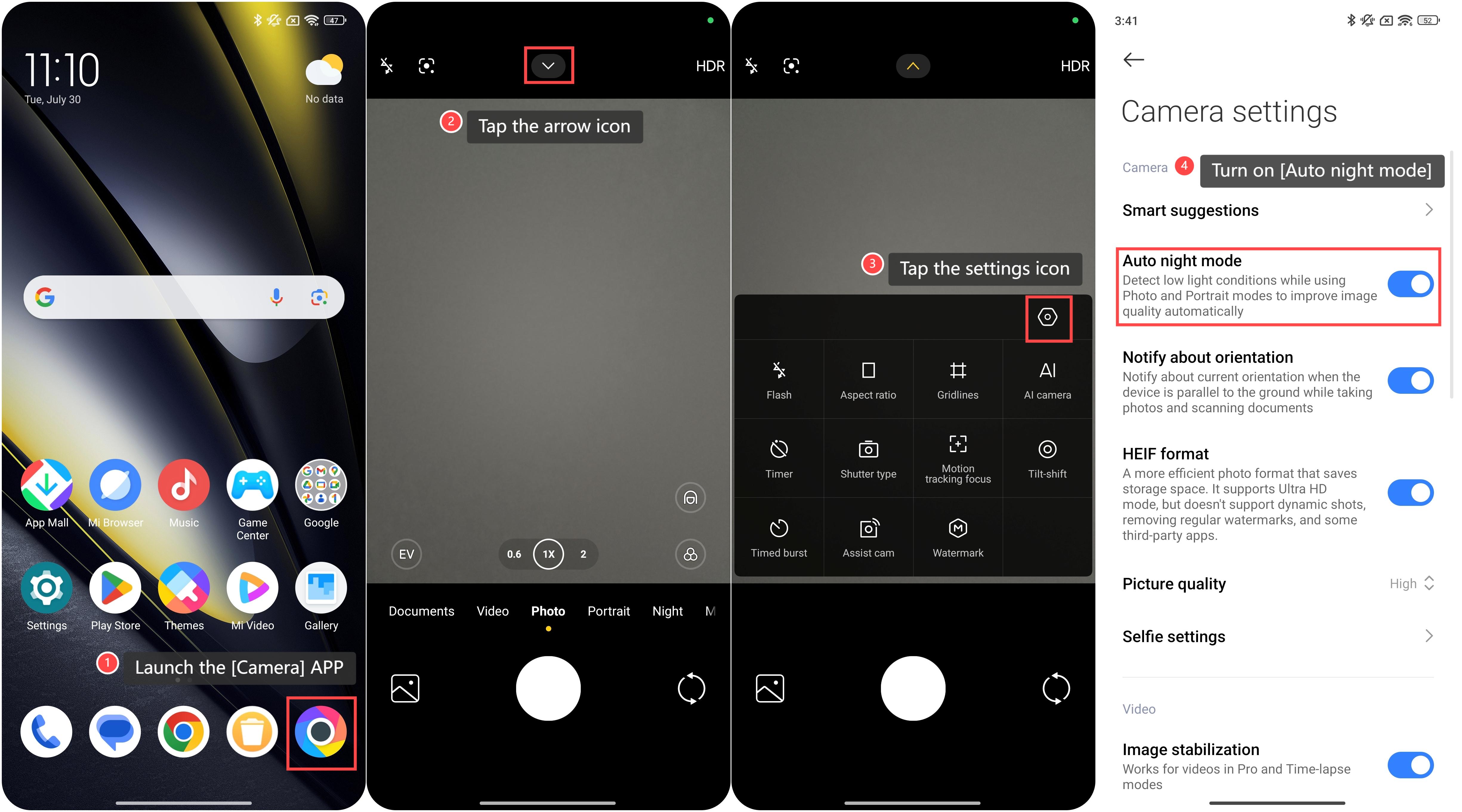 1.ナイトモードでは露光時間が長くなるため、ぼやけを避けるために、写真を撮っている間はカメラをしっかりと保持します。
