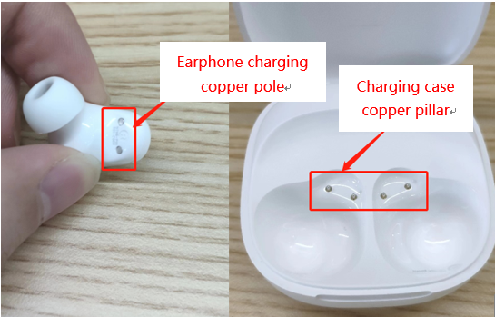 3.綿棒を使用して、イヤフォンと充電ケースの下部の銅柱を拭いて清掃します(異物の接触があるかどうか)。