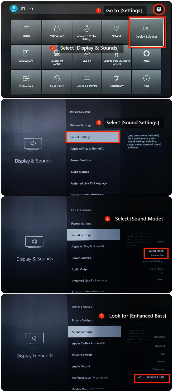 1. [設定] >> [ディスプレイとサウンド] >> [サウンド設定] >> [サウンドモード] に移動し、[Enhanced Bass] を探し>> Enhanced Bass モードを好みで使用するかどうかを選択します。