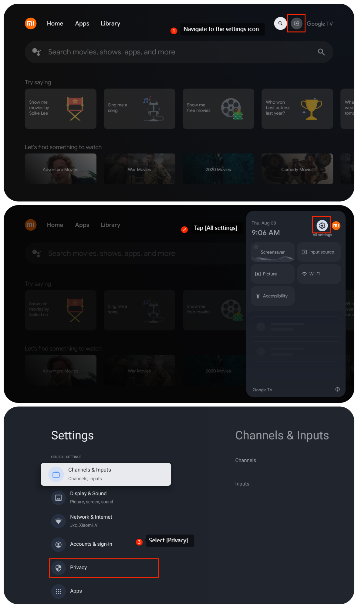 1. TVのホーム画面から、設定アイコンに移動します。