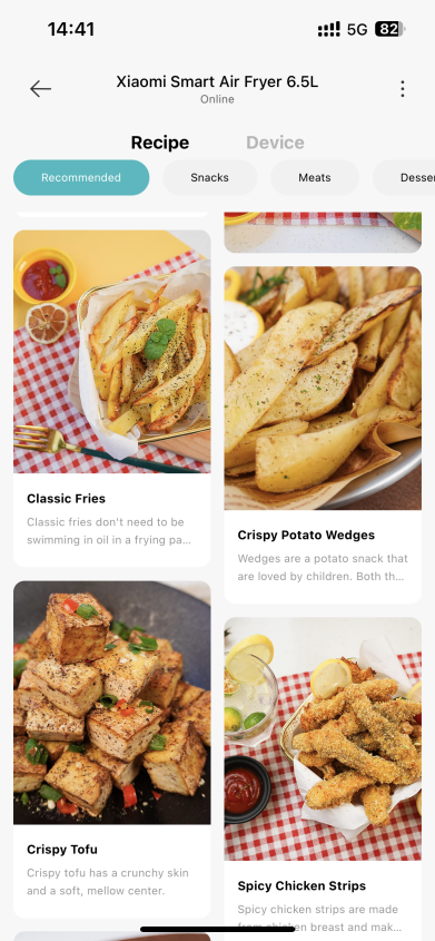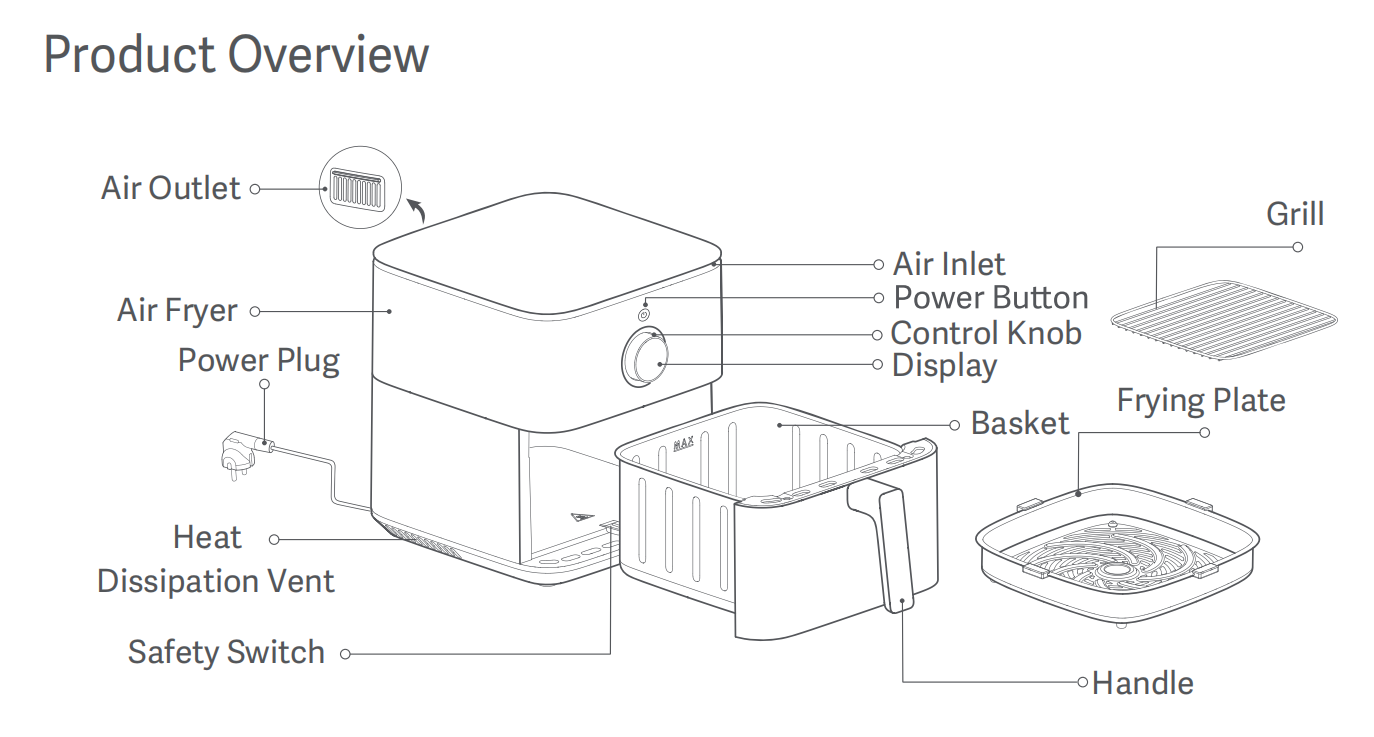 11.Q:Xiaomiスマートエアフライヤー6.5Lに臭いがするのはなぜですか? A :製品は、輸送プロセスを含め、工場を出る前に密封および保管されるため、通常の臭いが残ります。製品を受け取った後、バスケットとバスケットを清掃し、換気の良い場所に置いて乾かしてください。 ヒント: 初めて使用する前に、新鮮なレモンスライス/ガーリックカット/オニオンカット/フレッシュオレンジピールなどを使用してバスケットに入れ、エアフライヤーを200°Cの温度に設定して約5分間加熱し、実際の状況に応じて数回繰り返します。