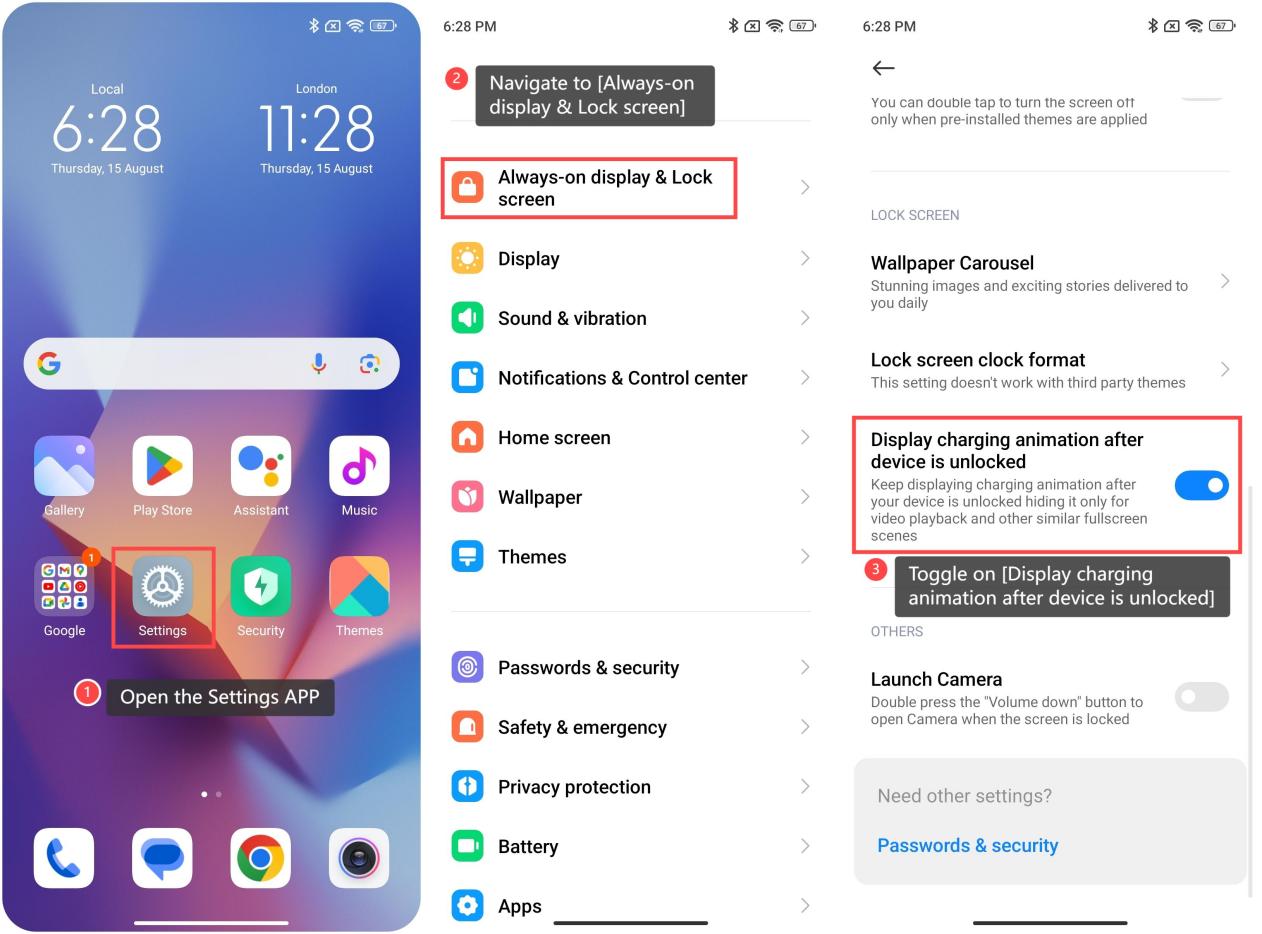 3.下にスクロールして、[デバイスのロックが解除された後に充電アニメーションを表示する] オプションを見つけます。このオプションをオンに切り替えると、充電アニメーションがアクティブになります。