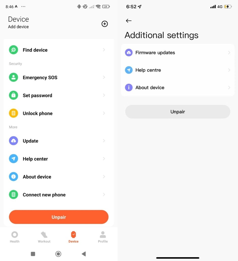 2. iOS電話の場合は、[Mi Fitness]アプリを選択し、[デバイス]<c10/>インターフェースの[追加設定]をタップしてから、[ペアリング解除]をタップします。
