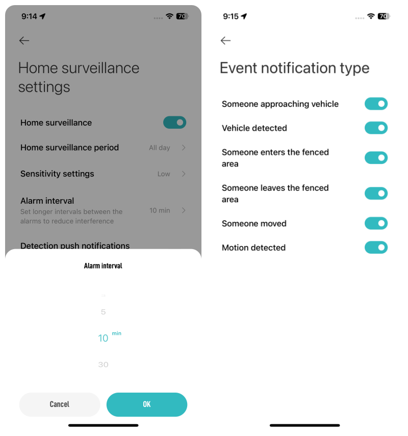 9. [検知プッシュ通知]をONにすると、イベントの種類を選択できます。タイプには、車両に接近する人、車両が検出される、誰かがフェンスで囲まれたエリアに入る、誰かがフェンスで囲まれたエリアを離れる、誰かが移動した、モーションが検出されました。