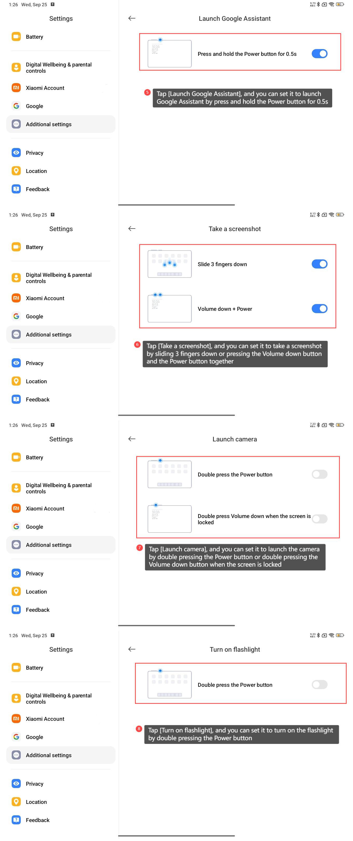 4. この表面で、[Googleアシスタントの起動]、[スクリーンショットを撮る]、[カメラの起動]、および[懐中電灯をオンにする]のジェスチャーを変更できます。