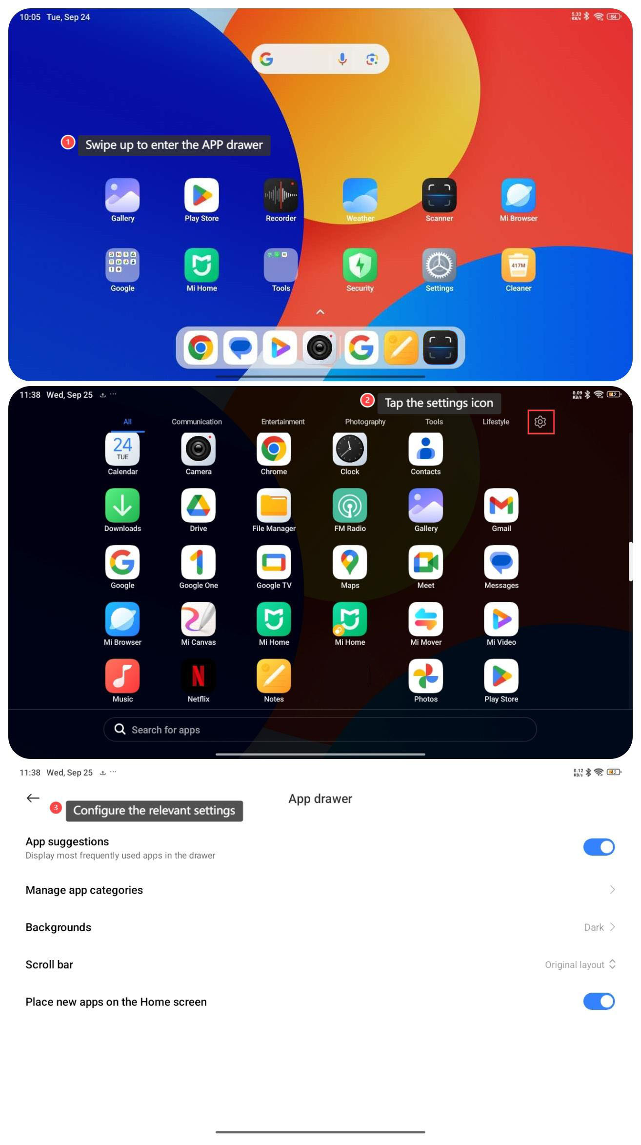 Redmi Pad SE 8.7は、インストールされているすべてのAPPを一元的に配置して見つけることができるAPPドロワーの適用をサポートしています。APPを名前ですばやく検索できます。多くの場合、APPのフォルダを再配置、非表示、または作成して、好みに合わせてレイアウトを調整できます。さらに、ホーム画面を乱雑にすることなく、頻繁に使用するAPPにすばやくアクセスできるようになります。