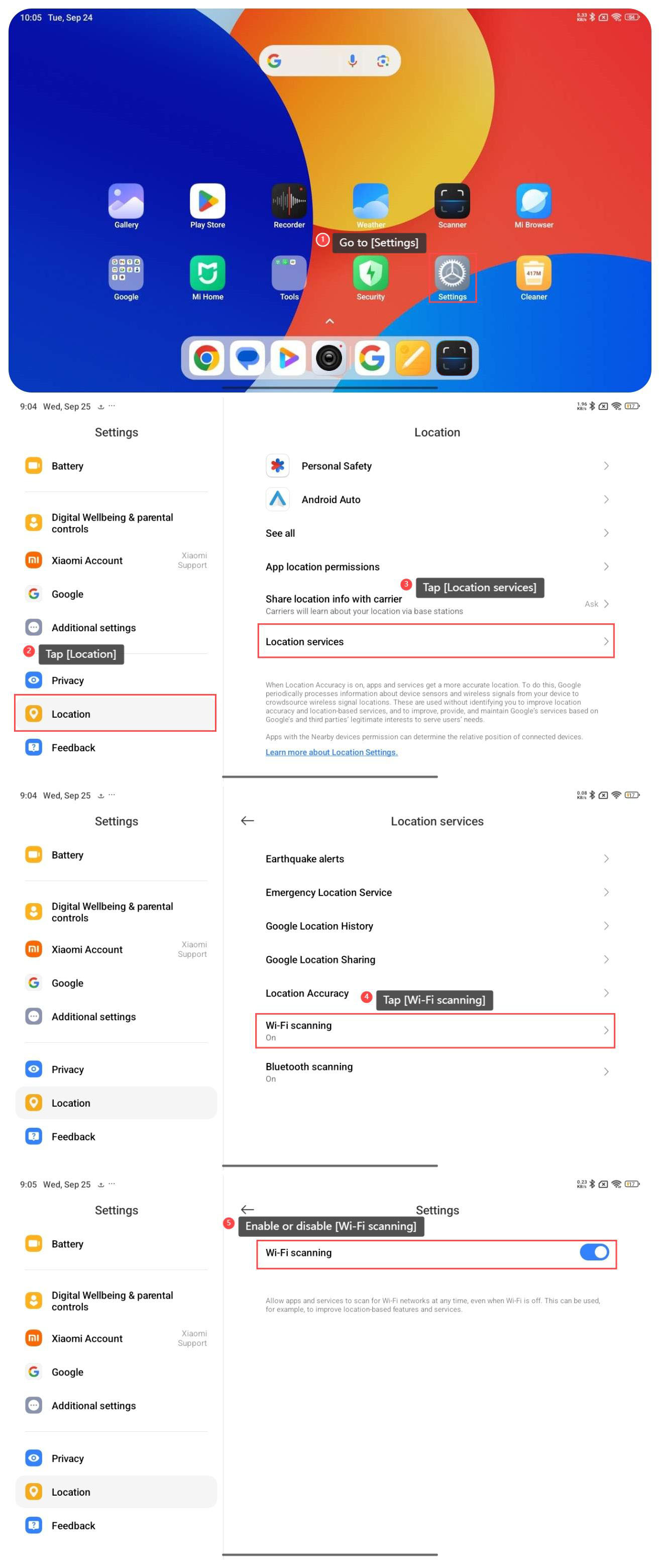 タブレットでWi-Fiスキャンをオンまたはオフにするには、次の手順を参照してください。