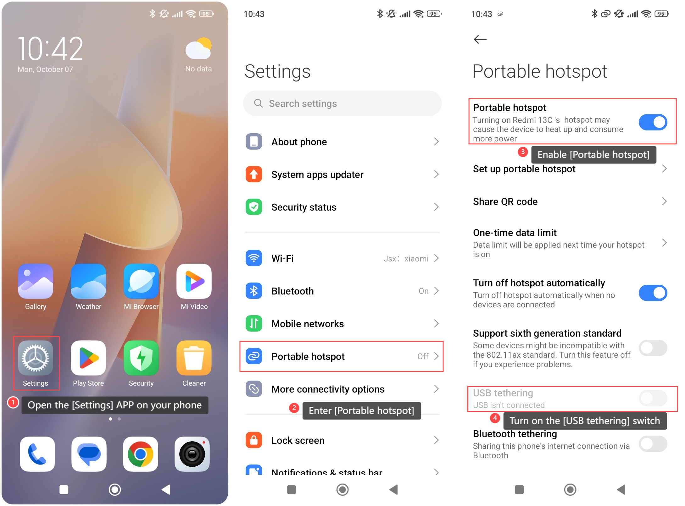 USB経由で電話のホットスポットを共有するには、次の手順を参照してください。