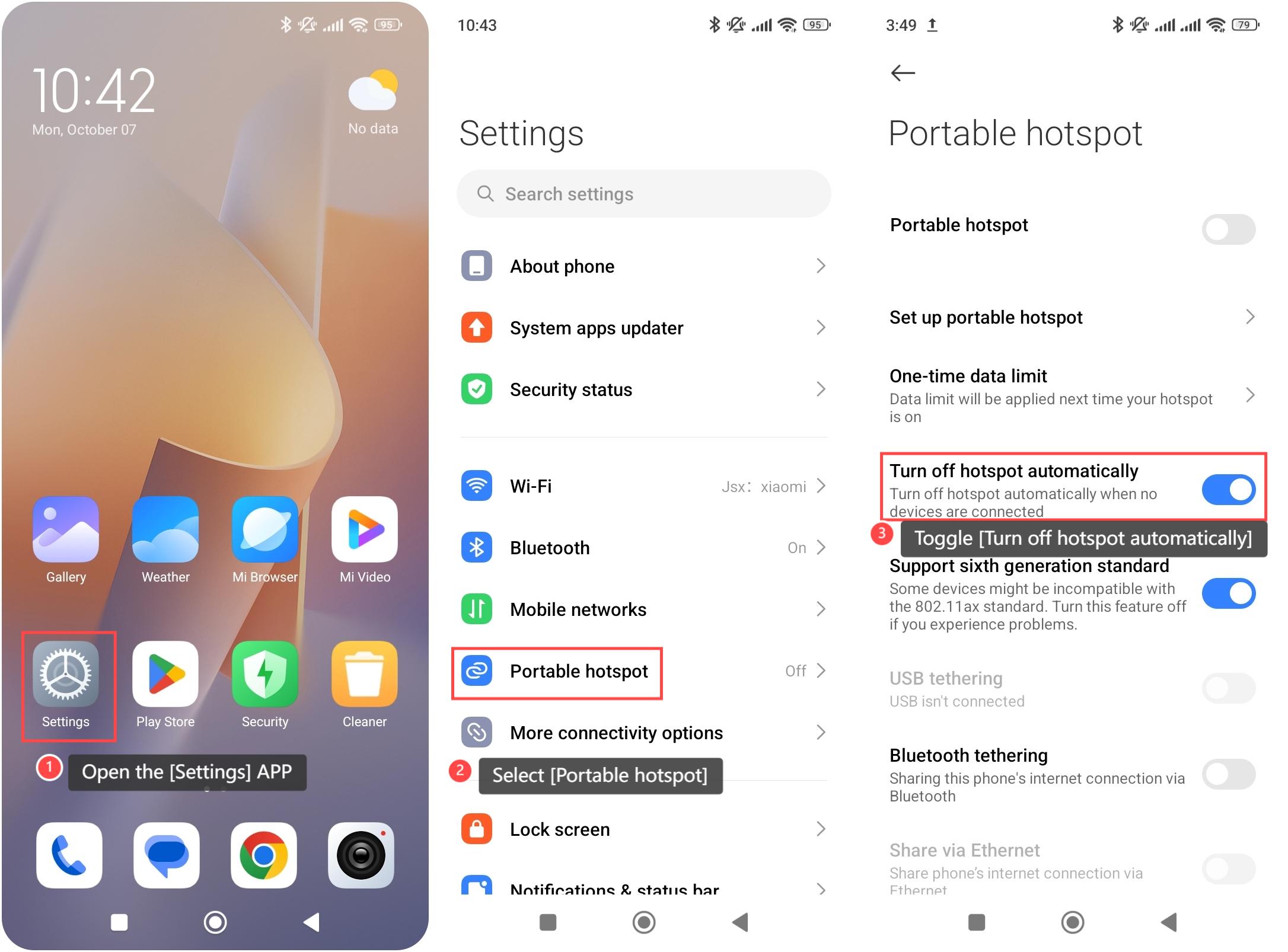 Redmi 13Cは、デバイスが接続されていないときにホットスポットを自動的にオフにする組み込み機能をサポートしています。ホットスポットを時間内にオフにするのを忘れた場合、この機能はホットスポットを自動的にオフにして、ネットワーク使用量を減らすことができます。