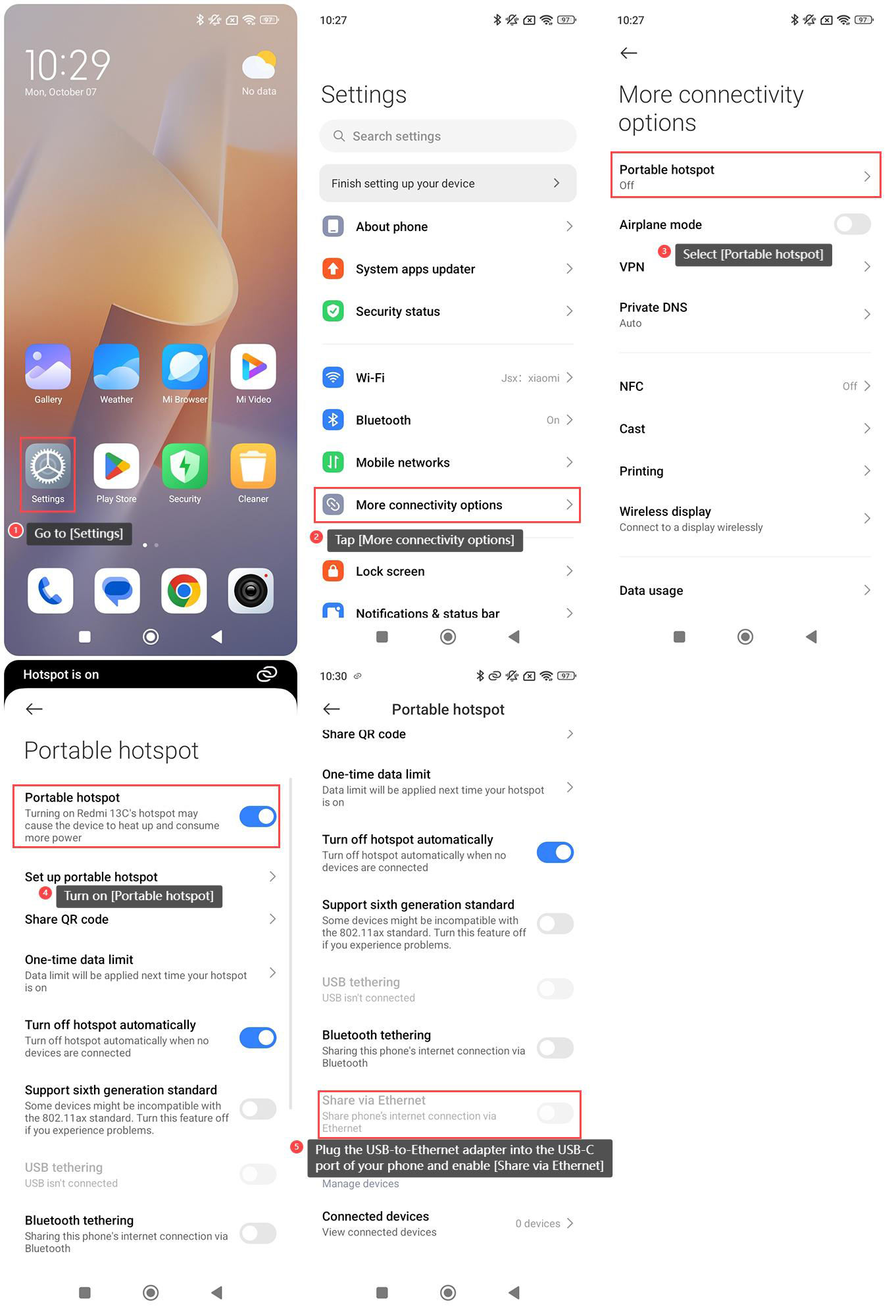 REDMI 13Cのホットスポットをイーサネット経由で共有する場合は、電話が直接イーサネット共有をサポートしていないため、USB-イーサネットアダプターを使用できます。